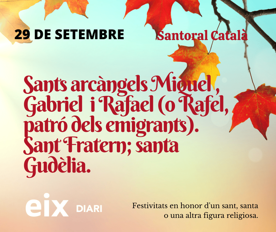 Sants arcàngels Miquel (patró dels radiòlegs i els radioterapeutes), Gabriel (patró de la radiodifusió i les telecomunicacions) i Rafael (o Rafel, patró dels emigrants). Sant Fratern; santa Gudèlia.