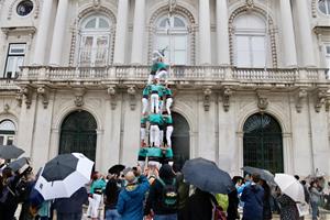 Els Castellers de Vilafranca desafien la pluja i porten els castells al centre de Lisboa. ACN
