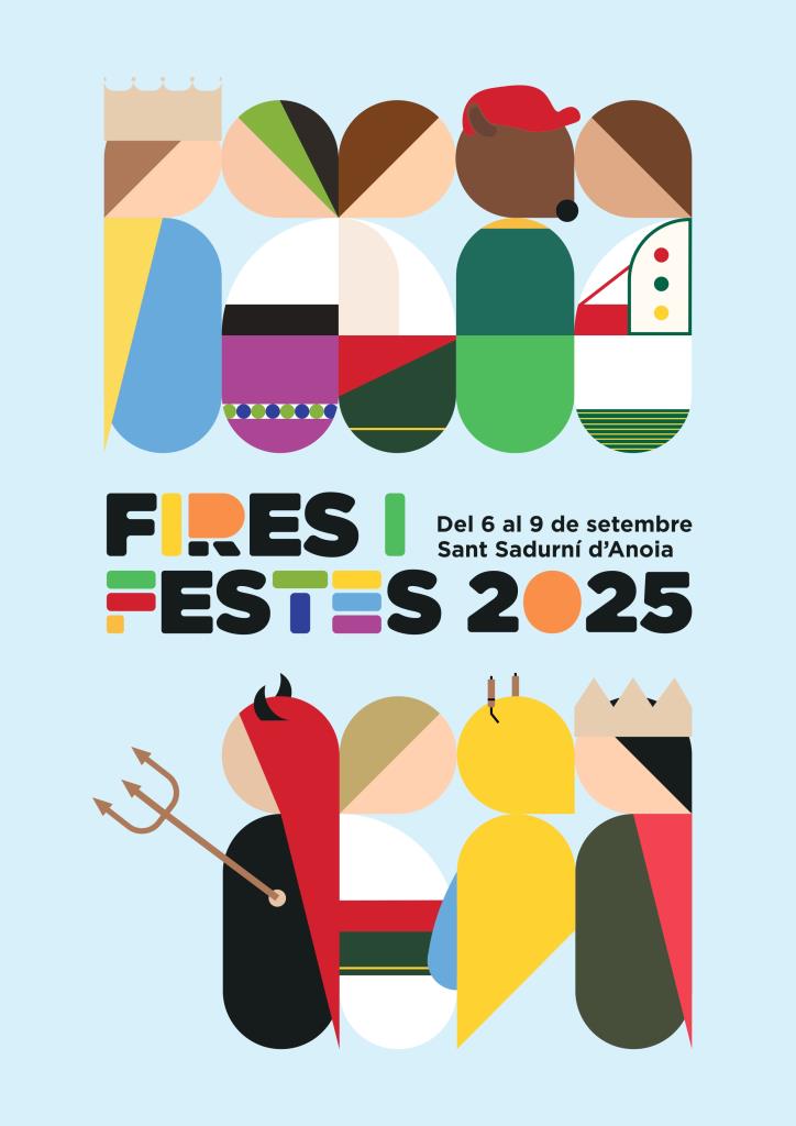 La imatge de les Fires 2025 porta la signatura de la dissenyadora sadurninenca Mariona Roca, que ha creat una composició clara i acolorida per representar els elements principals de la festa i posar en valor la tasca de les persones i colles que omplen els carrers de vida.