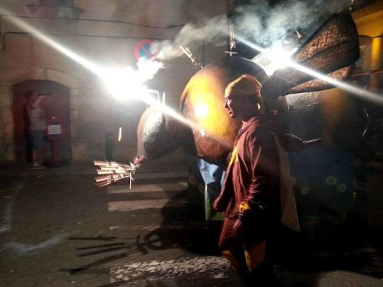 Aquest passat dissabte, el Borinot de Foc del Vendrell va visitar la població lleidatana Ribera d’Ondara, on s’hi celebrava el cinquè aniversari del Drac Aimeric i la primera Batalla de Foc.