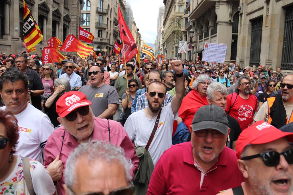 Milers de persones s'han manifestat aquest Primer de Maig pel centre de Barcelona en la protesta convocada pels sindicats majoritaris, CCOO i UGT, per reclamar un augment de salaris i revertir la creixent pèrdua de poder adquisitiu dels treballadors. La marxa, que ha aplegat 2.000 persones segons la Guàrdia Urbana i 5.000 segons els organitzadors, s'ha fet sota el lema 'Apujar salaris. Abaixar els preus. Repartir beneficis' i també serveix per "celebrar" fites recents com la reforma laboral, l'augment del salari mínim o la reforma de les pensions. Els manifestants han portat cartells on es podia llegir lemes com 'Salari o conflicte', 'Resignar-se és perdre' o 'Amb les coses de menjar no s'hi juga'.