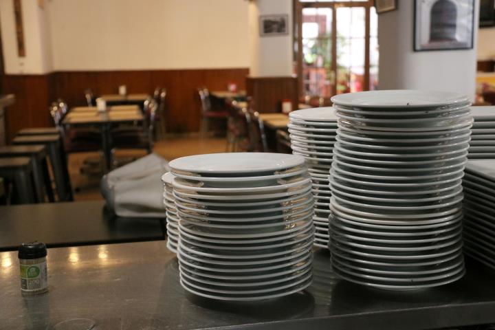 Pla detall de muntanyes de plats a la barra d'un bar restaurant tancat a Cubelles. Imatge del 4 de maig del 2020. ACN
