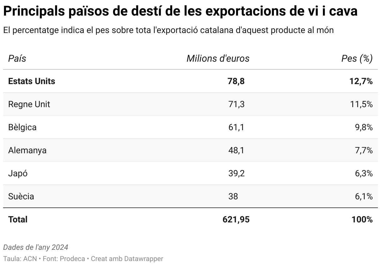 Aquest subsector agroalimentari té en els Estats Units el seu principal mercat d’exportació, després de la UE en conjunt. Dels gairebé 622 milions d’euros que els vins i caves catalans van facturar l’any passat en vendes a l’estranger, 78,8MEUR es van generar als Estats Units. Això representa un 12,67% del total, per sobre de l’exportat a territoris com el Regne Unit (11,46%) i països com Bèlgica (9,82%), Alemanya (7,74%) o el Japó (6,31%).