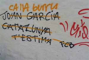 La pintada sembla voler dir que de manera implícita que si no ets del Barça ja no ets català, o no estimes Catalunya, o la teva catalanitat és més que dubtosa