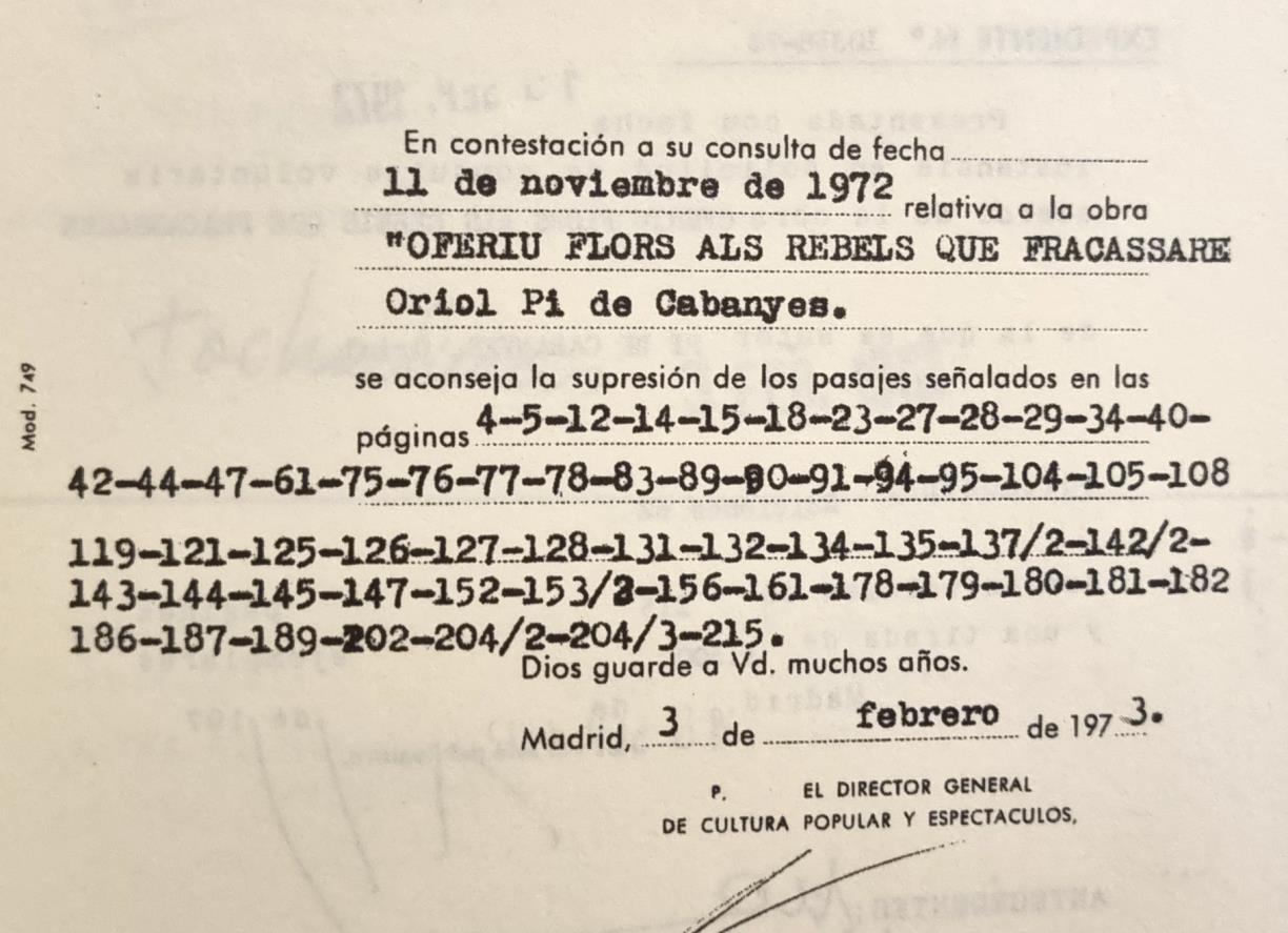 Llistat de les pàgines d'Oferiu flors als rebels que fracassaren' que tenien trossos censurats