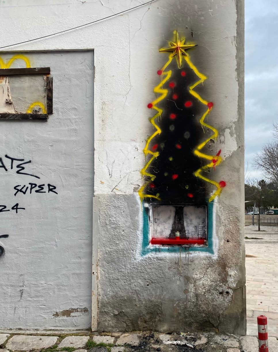 Però amb el treball d’un pinzell, una mica de groc i uns puntets vermells, les restes del pessebre van reaparèixer convertides en un arbre de Nadal.