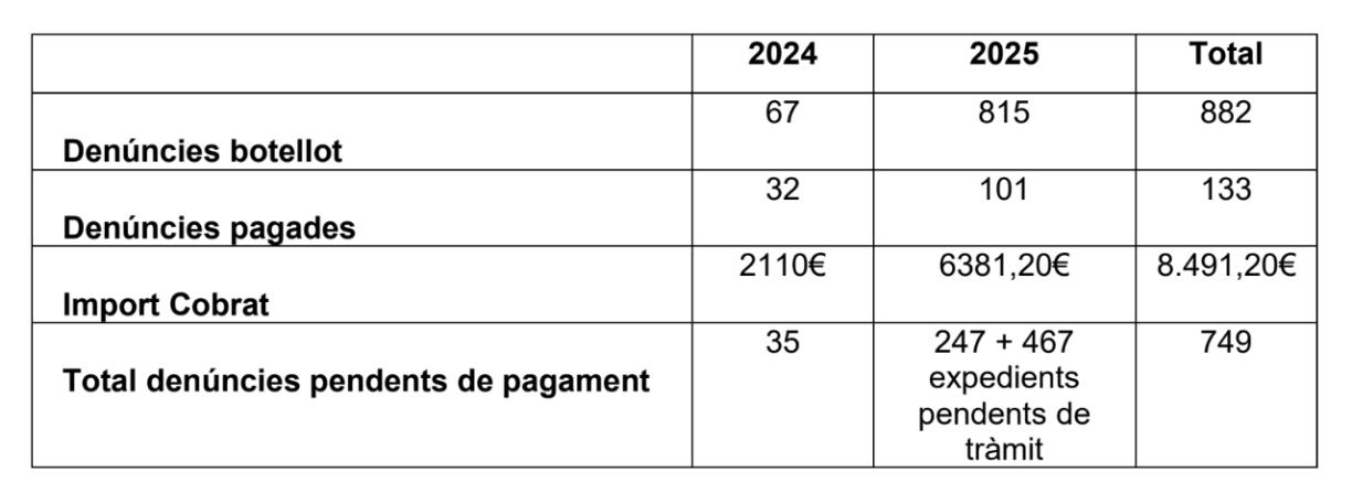 Segons l’òrgan de Convivència i Civisme, les denúncies han passat de 67 l’any 2024 a 815 l’any 2025, un increment del 1.116% en només dotze mesos. En total, entre els dos exercicis analitzats s’han registrat 882 denúncies per consum d’alcohol a la via pública.