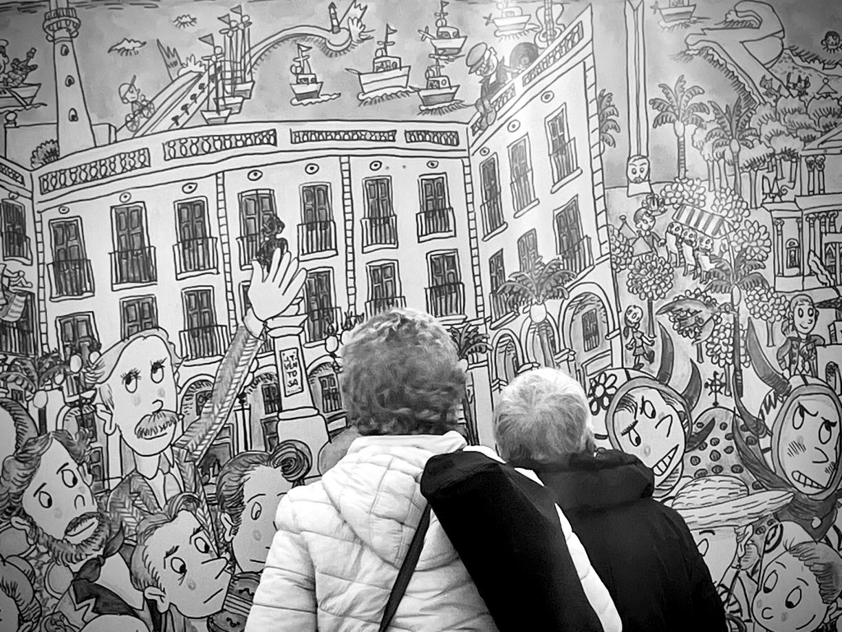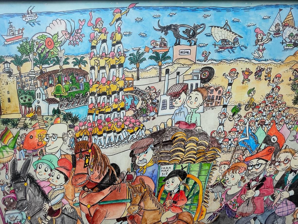 El mural és bonic. I tant que sí! T’hi perds. És com jugar a trobar On és en Wally. M’agrada aquest caos ordenat que fa volar la imaginació. Pel què escolto dir als veïns, a ells també els agrada. Venen els vells i s’hi estan una bona estona fent descobriments abans d’anar a visitar les obres: que si hi veuen un laberint, que si aquell home és l’Altadill, que si en Pere Tàpies és al terrat de l’Ajuntament…