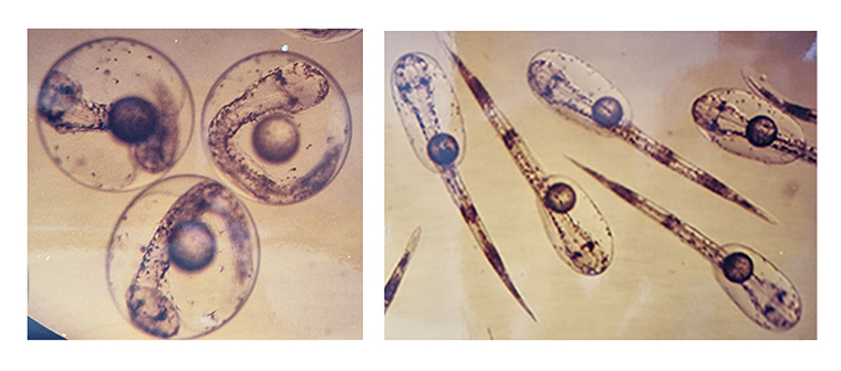 A l'esquerra, cries de peix dins de l'ou, amb la bossa de menjar de la que s'alimentaran després de néixer. A la dreta, els petits peixos, sortits de l'ou i encara amb la bossa de menjar.