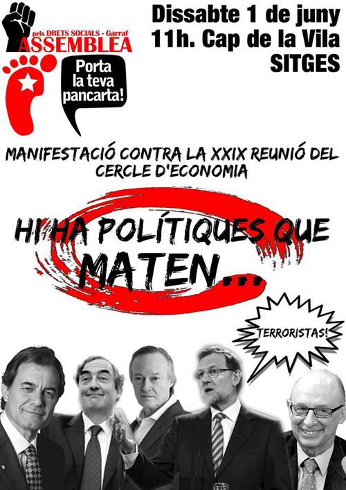 Els dies 30, 31 de maig i 1 de juny el Cercle d'Economia es reunirà a Sitges sota el títol «Perquè Europa funcioni». Nosaltres, l'1 de juny, estarem manifestant-nos per mostrar el nostre rebuig a aquest lobby sota el lema «Hi ha polítiques que maten». I és que el Cercle d'Economia és un lobby de pressió neoliberal que influeix en la presa de mesures polítiques vinculades a l'economia amb un únic objectiu, mantenir un sistema on les classes populars no tenen drets per així engrandir el poder econòmic d'una elit financera.