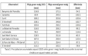 A la resta d’observatoris penedesencs oficials, amb períodes de dades més curts, observem desviacions negatives de pluja significatives en tots ells en molts casos amb dèficits superiors als 100 mm en aquest període Gener-Maig de 2015. En la següent taula de dades observem la pluja recollida al llarg del 2015 fins al passat més de maig i la teòrica normal fins aquest mes. Les dades són més que significatives i ens porten a parlar d’un període de sequera que tot i ser propi del nostre clima mediterrani és preocupant alhora d’encarar ara els mesos més eixuts i càlids de l’any.
