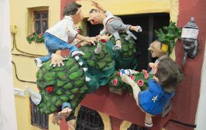 Amb un resultat invers -però no pas a la contra- dels escultors de les colossals imatges que recorren festivament els carrers i poblen els nostres somnis més barrocs, Iakare, el Sergi Salvó, dona vida als seus “ninots”, com ell els anomena. Jo, als seus “ninots” n’hi diria ninos, sense la t final que pot arribar a tenir un matís desdenyós. Aquest ninos, amb un resultat invers als constructors de gegants, miniaturitzants en comptes de engrandits, els personatges de Iakare, compleixen la mateixa funció que els seus encimbellats confrares, dracs, gegants, bèsties i armadures fabuloses de tota mena. Ninos plens de bonhomia, ninos entremaliats, que caricaturegen amb intencionalitat trapella, atrevida, les accions en que participen. Accions, sí, perquè els ninos del Sergi, participen sempre, d’alguna acció o altra; diríeu que no saben estar-se quiets, i tot i la seva necessària actitud hieràtica, enterca (ja que en definitiva que no són altra cosa que escultures) evidencien que en el moment en què els han “enganxat” fent la darrera entremaliadura, hi arriben d’una acció anterior tant o més temerària que la del moment en que els Sergi els ha “retratat”.