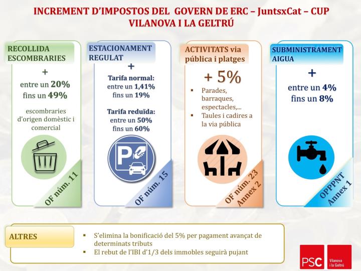 El govern d’ERC-JuntsxCat-CUP proposa un increment d’entre el 20 i el 49% de la taxa d’escombraries, del 4 al 8% de l’aigua i altres increments, a més, 1/3 dels rebuts de l’IBI de la ciutat continuarà pujant