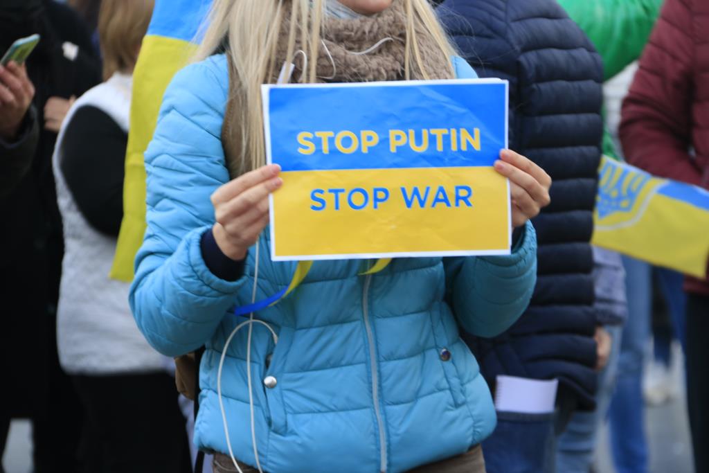 Una dona sosté un cartell que demana que s'aturin la guerra i Putin durant una concentració a la plaça Catalunya de Barcelona . ACN / Laura Fíguls
