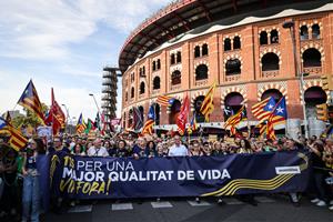 Les quatre columnes han avançat de manera eminentment festiva i han arribat a plaça Espanya una mica més tard del previst, acompanyades durant el transcorregut per manifestacions de caire lúdic com ara exhibicions castelleres o batucades.