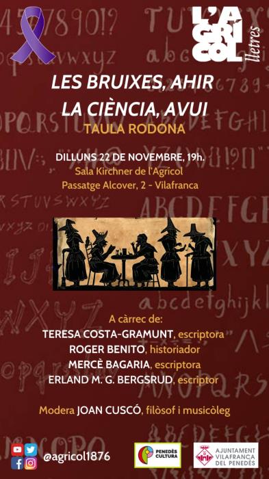 El dilluns 22 de novembre se celebrarà una taula rodona sobre “Les bruixes, ahir. La ciència, avui.”, a les 19h, a la Sala Kirchner de l’Agrícol organitzat en motiu de la celebració del 25N. L’acte comptarà amb la participació de Teresa Costa-Gramunt, escriptora, Roger Benito, historiador, Mercè Bagaria, escriptora i Erland M. G. Bergsrud, escriptor. Joan Cuscó Clarassó, filòsof, musicòleg i president del Centre Artístic Penedès L’Agrícol, moderarà l’acte.