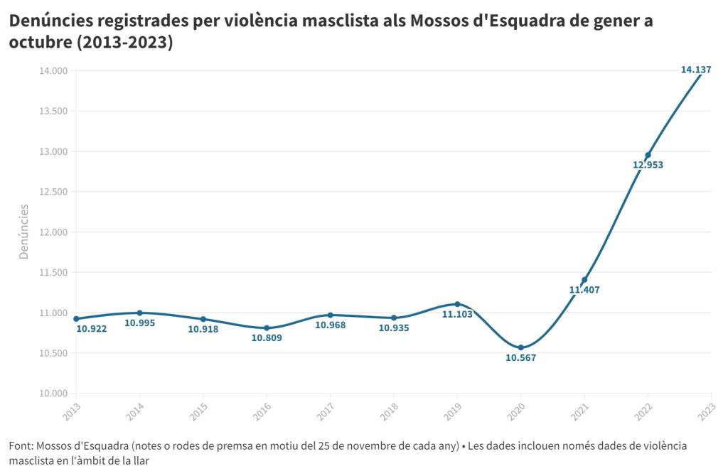 Les denúncies per violència masclista en l’àmbit de la parella a Catalunya continuen augmentant significativament any rere any, sobretot després del 2020 i la covid. De l’1 de gener al 31 d’octubre, els Mossos d’Esquadra han instruït 14.137 denúncies, un 9,6% més respecte el mateix període del 2022, i s’han detingut 6.056 homes, cosa que suposa un increment del 13,2% respecte l’any passat. Els delictes que més es denuncien són el maltractament a la llar, amb un 36,8% del total, amenaces, 22,8%, trencament de condemna, 14,3%, i violència física o psíquica habitual, un 8,3%. De fet, el trencament de condemna és un dels que més augmenta, un 17%, però encara ho fan més l’assetjament, amb un 62% més, i els sexuals, amb un 38%.