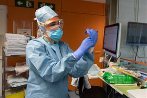 Una professional sanitària entrega una mostar per fer la prova del coronavirus a l'Hospital Clínic. Francisco Avia_Hospital C