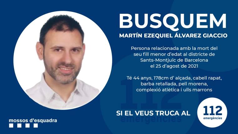 Els Mossos d'Esquadra han difós aquest dimecres el nom i la fotografia del pare del nen de 2 anys mort en una habitació d'un hotel de Barcelona. El cos policial ha demanat la col·laboració ciutadana per trobar el presumpte homicida, que va fugir de l'hotel dimarts a la nit. Els Mossos expliquen que l'home té 44 anys, fa 178 cm d'alçada, porta el cabell rapat, barba retallada, pell morena, complexió atlètica i ulls marrons. Segons els agents, és "una persona relacionada amb la mort del seu fill menor d'edat al districte de Sants-Montjuic". Els Mossos han demanat que qualsevol persona amb informació truqui al 112. Els Mossos han informat que l'home que busquen es diu Martín Ezequiel Álvarez Giaccio. El Govern i l'Ajuntament de Barcelona han condemnat l'homicidi del nen, que la investigació apunta que es tractaria d'un cas de violència vicària.