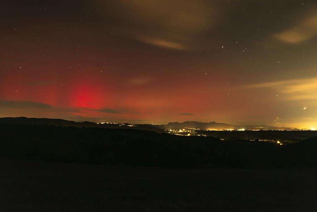 Una aurora boreal s’ha pogut veure aquest dijous a la nit des de diversos indrets de Catalunya, en una imatge que s’ha difós a través de les xarxes socials i que recorda la que ja es va produir el maig passat. A partir de les nou de la nit, testimonis de pobles i ciutats de l’àmbit metropolità, de la Catalunya Central o del sud del país han fet públiques fotografies que mostren un fenomen astronòmic poc habitual en aquestes latituds del planeta causat per una tempesta geomagnètica. Al Penedès també ha estat visible aquest fenomen que ha pogut capturar en una fotografia Xavi Navas des de Sant Quintí de Mediona.