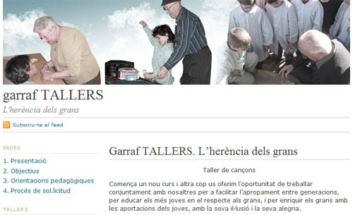 Garraf Tallers, programa impartit per voluntaris de la gent gran, té com a objectiu fomentar les relacions intergeneracionals, conservar les tradicions de la comarca i estimular la gent gran a ser part activa en la comunitat, tot creant plataformes i espais on tinguin cabuda els seus projectes i iniciatives. Dins la proposta d'aquest any s'inclouen els tallers: Els contes de l'àvia, Jugar amb els colors, Construïm titelles, Flors de paper, Papiroflexia, Gaudim de la música, El curtmetratge i Jocs antics, entre d'altres. A la carpeta també es poden trobar els tallers de marqueteria i cuina del Garraf, que s'oferiran a grups d'adults que estiguin interessats.