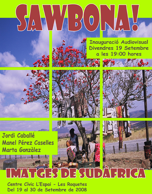 El proper divendres 19 de setembre tindrà lloc la inauguració de la exposició fotogràfica: "Sawbona!. Imatges de Sudàfrica" a les set de la tarda a la Sala Sol del Centre Cívic l'Espai de Les Roquetes, amb la presentació d'un audiovisual sobre el tema. Aquesta activitat està inclosa dins la programació de "Viu el Parc del Garraf" organitzat per la Diputació de Barcelona.