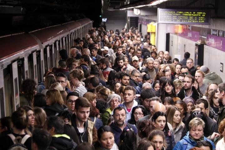 Pla general de les aglomeracions a l'estació de la L2 a Sagrada Família durant la vaga de metro, el 8 d'abril del 2019. ACN
