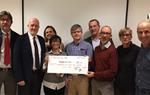 Xavier Lahoz i Estela Campañá, organitzadors de la prova esportiva, juntament amb l’alcalde de Sitges, Miquel Forns, han lliurat el taló per destinar-lo íntegrament al laboratori de recerca del càncer infantil