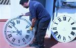 Operaris de l'empresa Rifer Rocafer han fet aquest matí el canvi de l’esfera i han col·locat uns leds que faran més visible el rellotge durant la nit