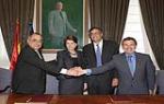 El conseller de Política Territorial i Obres Públiques, Joaquim Nadal, i la ministra de Foment, Magdalena Álvarez, juntament amb els alcaldes de Tarragona, Josep Felix Ballesteros, i de Sitges, Jordi Baijet, han signat avui a Madrid dos importants convenis per a la integració urbana del ferrocarril al seu pas per aquestes dues ciutats.