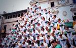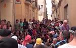 Un grup de persones assegudes a terra impedeixen el pas dels balls pel carrer Escudellers i la cercavila manté el recorregut habitual