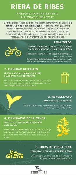 Dins del projecte de recuperació de l’Autòdrom Terramar s’inclou un projecte de recuperació de part de la Riera de Ribes, actualment en un estat molt millorable per la presència de deixalles i espècies invasores. Aquesta és una de les mesures que els impulsors de la iniciativa han treballat amb especialistes en ciències ambientals i organismes públics i que es va incloure en el conveni signat el passat mes d’abril amb l’Ajuntament de Sant Pere de Ribes.
